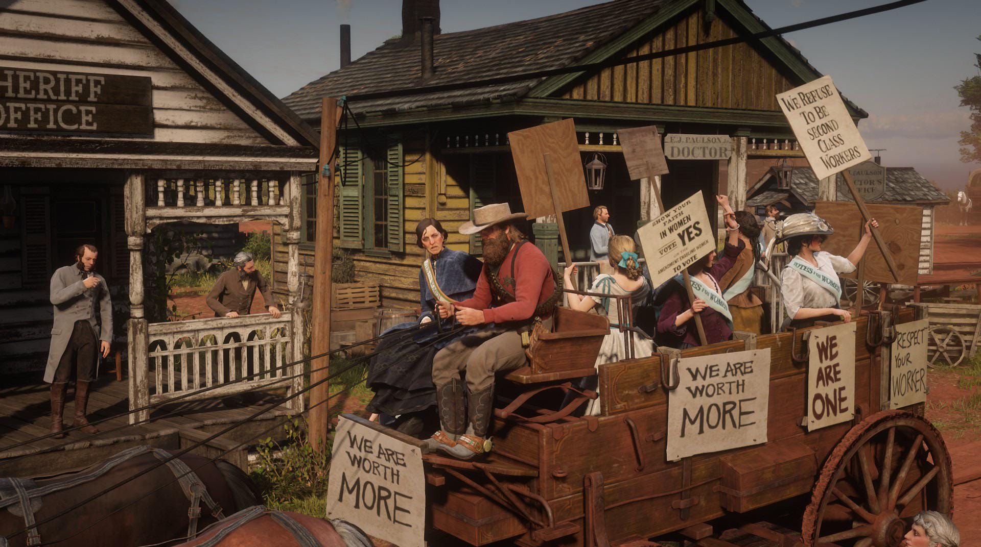 RDR2-нің бір миссиясында Артур Морган суфражист әйелдерге (әйелдердің сайлау құқығы үшін күресушілер) көмектеседі. Бұл тарихи мазмұнға сай: шынымен де XIX ғасырдың соңында АҚШ-тың батыс штаттарында әйелдердің дауыс беру құқығын талап етіп, алғашқы саяси қозғалыстар басталған еді.